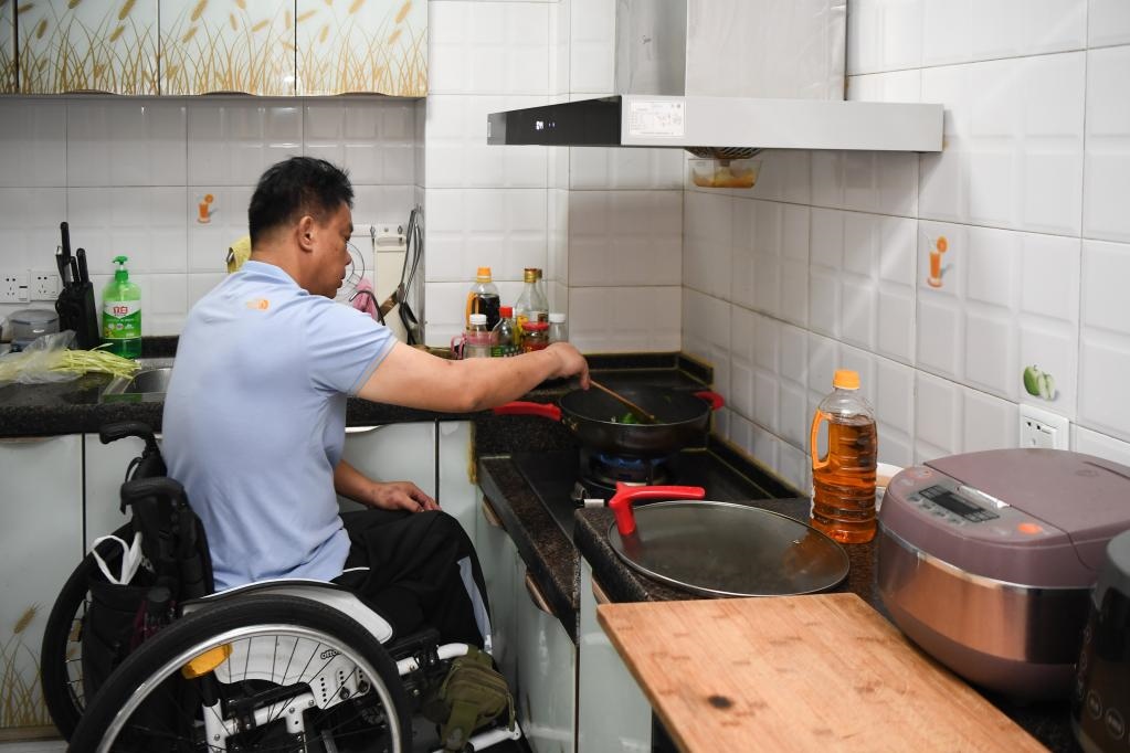 2021年8月25日,一位殘疾人在湖南省長(zhǎng)沙市天心區(qū)家中的定制低位灶臺(tái)上炒菜。新華社記者 薛宇舸 攝