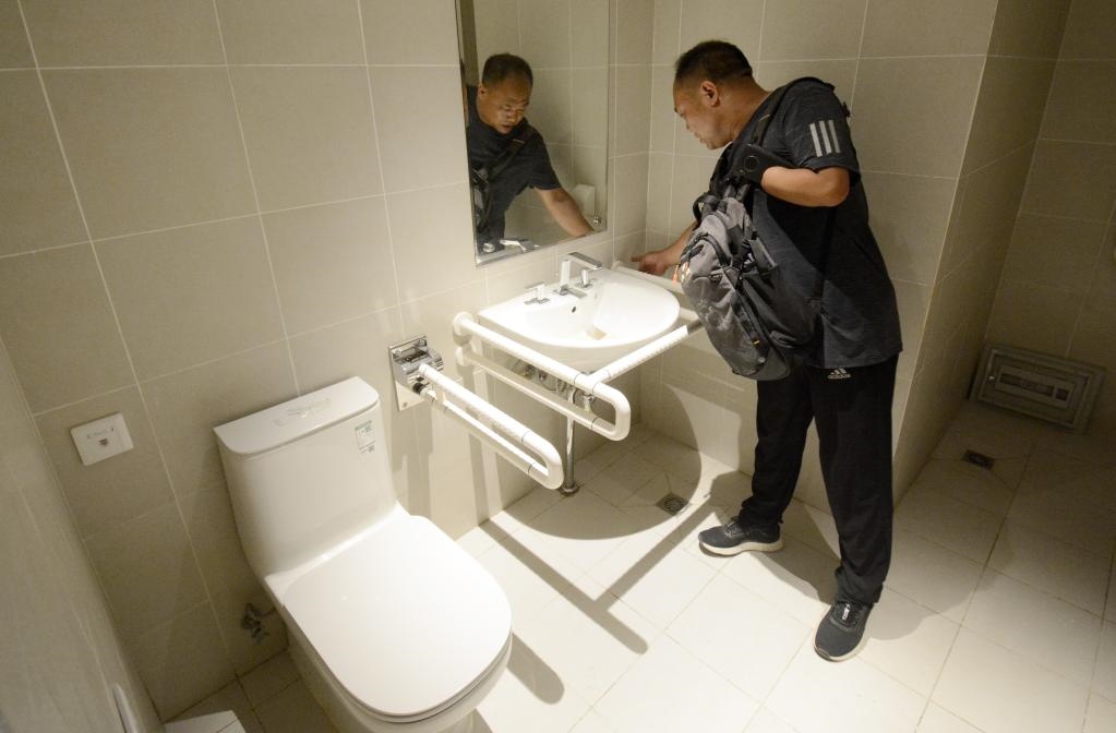 2021年7月15日,無(wú)障礙專(zhuān)家在北京延慶賽區(qū)冬奧村檢查室內(nèi)衛(wèi)生間無(wú)障礙設(shè)施。新華社記者 李欣 攝
