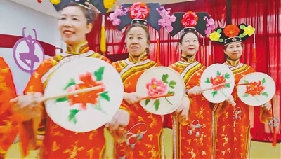 這是呼和浩特市新城區(qū)文化館老年滿族太平鼓舞隊(duì)表演時(shí)的一個(gè)場(chǎng)景。
