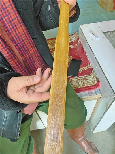 “用彈性很好的竹子或木頭作為弓胎,制作弓里的牛角一般是水牛角,或者巖羊角也可以,貼在弓外的牛筋來自春天的牛,這時候牛比較瘦,牛筋油脂少、有彈性。膠則是用魚膘、魚皮、豬皮、馬皮等熬制的膘膠,最外面還要貼一層蛇皮或者樺樹皮,防止受潮?!敝Z敏朝魯說。