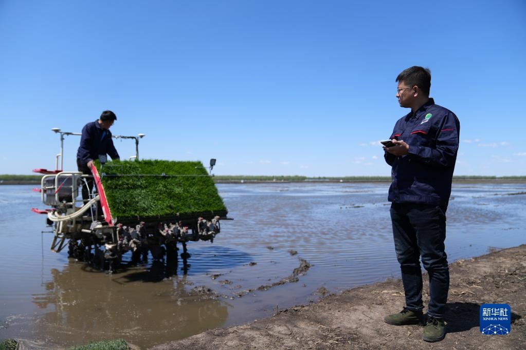 陸向?qū)?右)用手機(jī)操控帶有北斗導(dǎo)航系統(tǒng)的插秧機(jī)(5月18日攝)。新華社記者 王建威 攝