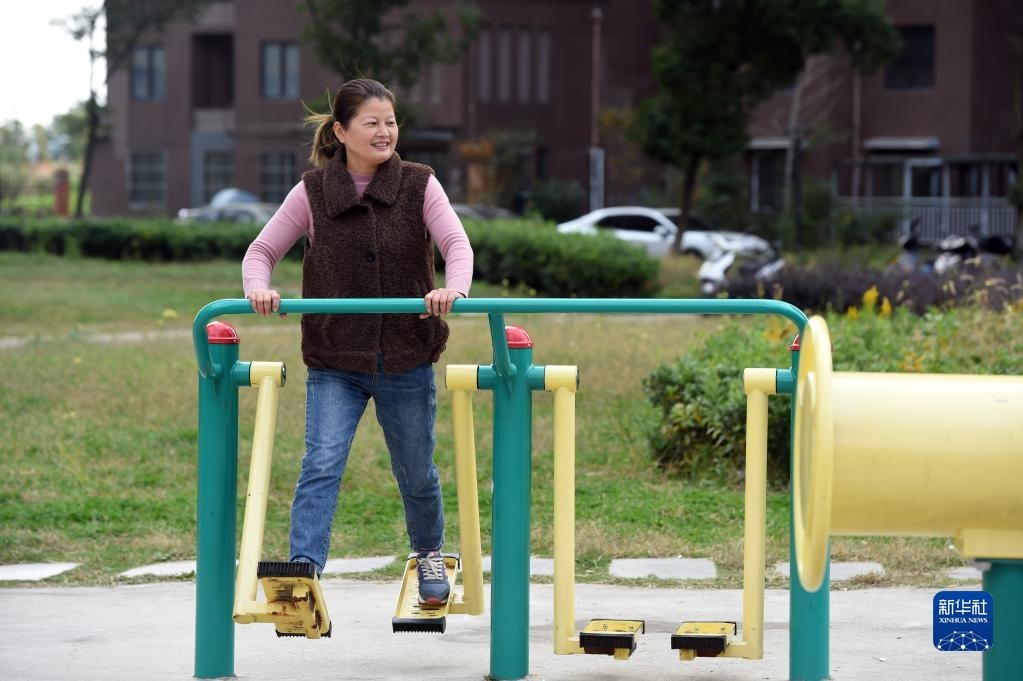安徽省馬鞍山市薛家洼的上岸漁民陳蘭香在新家所在的小區(qū)里鍛煉(2020年10月31日攝)。新華社記者 周牧 攝