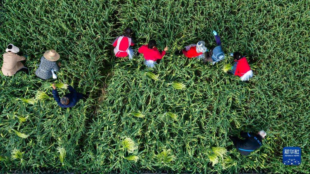 在成都市溫江區(qū)永寧街道八角社區(qū),農(nóng)民在蒜稻輪作田里采收蒜薹(3月23日攝,無人機照片)。新華社記者 沈伯韓 攝
