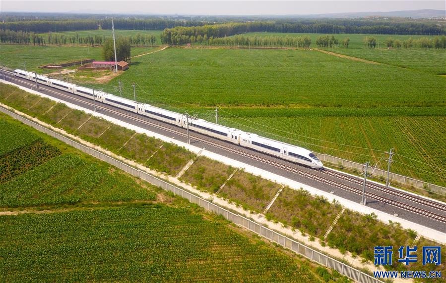 一列“和諧號”動車組列車行駛在內(nèi)蒙古赤峰市元寶山區(qū)的田野間(6月30日攝,無人機照片)。 當日,隨著G8382次“和諧號”動車組列車從內(nèi)蒙古赤峰站緩緩駛出,喀左至赤峰高鐵全線開通運營。該線經(jīng)喀左站與京沈高鐵接軌,內(nèi)蒙古赤峰地區(qū)由此接入全國高鐵網(wǎng)。 新華社記者 彭源 攝 -